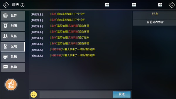 《剑之荣耀》聊天频道分类:世界、战团、队伍、区域、系统、私聊。