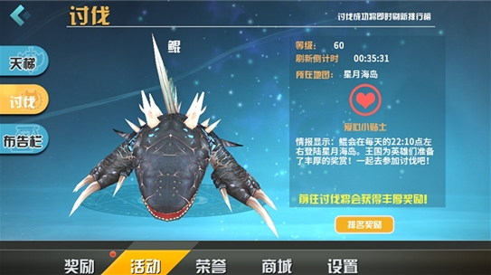 【魔物讨伐】:每日22点10分,世界BOSS“巨鲲”将在星月海岛进行登陆。国王下令讨伐巨鲲,并为英勇的骑士们准备了丰厚的奖赏!骑士们,集结起来!一起去参加世界BOSS讨伐吧!